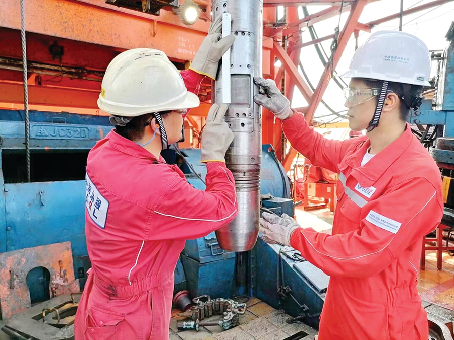 工程師在鉆臺(tái)現(xiàn)場(chǎng)測(cè)量檢查“璇璣”2.0旋轉(zhuǎn)導(dǎo)向狀態(tài)。