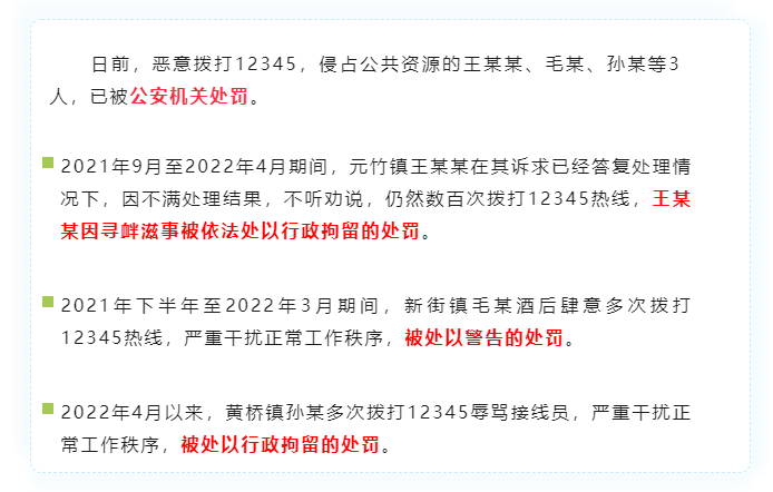 12345熱線(xiàn)管理機(jī)構(gòu)對(duì)行為人實(shí)行30個(gè)自然日內(nèi)限制占用12345電話(huà)資源的措施。