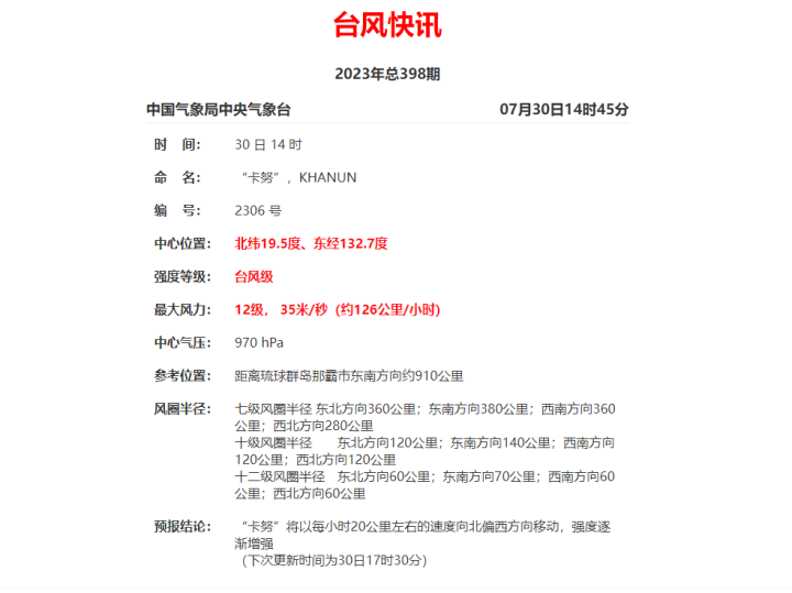 遠(yuǎn)在海上的今年第6號(hào)臺(tái)風(fēng)“卡努”(KHANUN)正在加強(qiáng)!7月30日14時(shí)定位信息來看,“卡努”已晉級(jí)為臺(tái)風(fēng)級(jí),其中心附近最大風(fēng)力已達(dá)12級(jí)(35米/秒),中心最低氣壓970hPa。