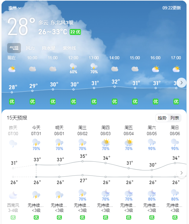據(jù)惠州市氣象臺(tái)7月31日08時(shí)50分發(fā)布的 【惠州一周天氣趨勢(shì)】: