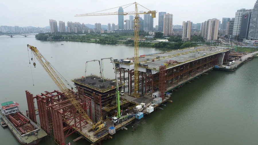 鵝城大橋位于惠州市惠城區(qū),主線全長(zhǎng)2974米,按雙向6車道設(shè)計(jì)。目前,主橋樁基、承臺(tái)已完工,江北側(cè)鋼梁架設(shè)已完成,5個(gè)墩身已完成4個(gè),主橋下部結(jié)構(gòu)施工已接近尾聲,江東側(cè)和江中心合攏段鋼梁架設(shè)施工正有序進(jìn)行。