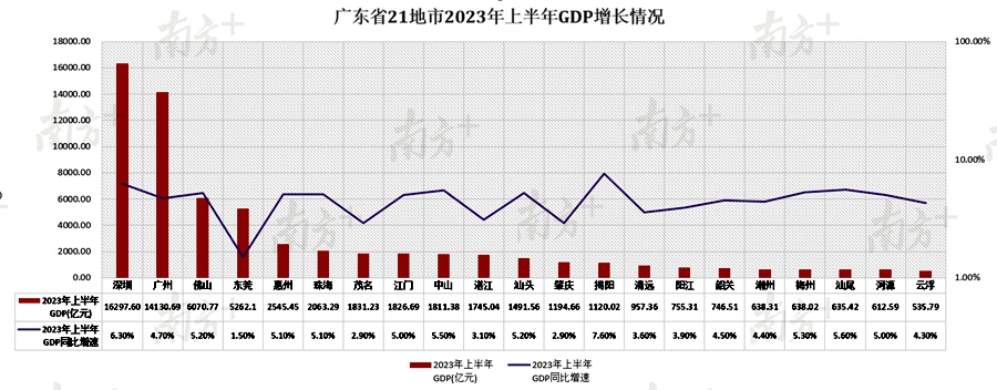 從地區(qū)生產(chǎn)總值來看,廣東的四座“萬億城市”——深圳、廣州、佛山、東莞,攜手沖刺“萬億城市”的惠州,今年上半年GDP總量“毫無懸念”地穩(wěn)居全省前五。其中,深圳以16297.6億元的地區(qū)生產(chǎn)總值領(lǐng)跑全省,6.3%的增速也高于全省1.3個百分點。