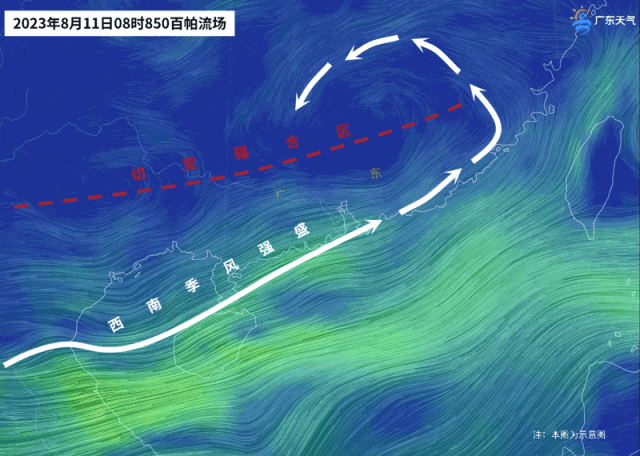 雖然兩個臺風(fēng)都不來廣東,但也會間接給廣東帶來一些降雨。從8月11日的流場圖可見,雙臺風(fēng)北上的同時,位于南海的西南季風(fēng)也有所北抬,季風(fēng)云團將會爬上華南沿岸。