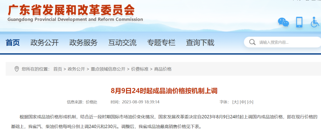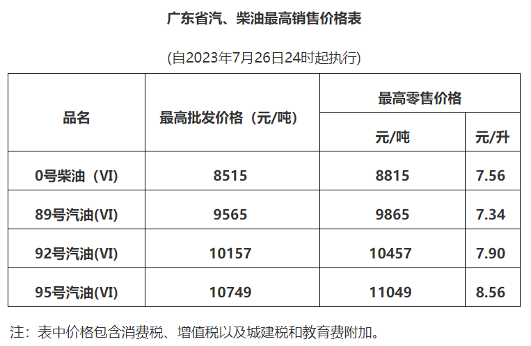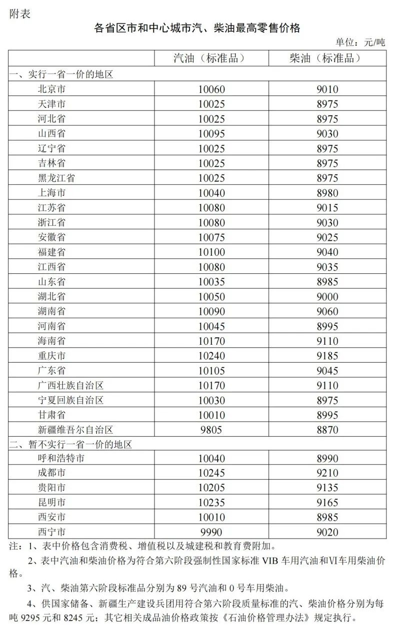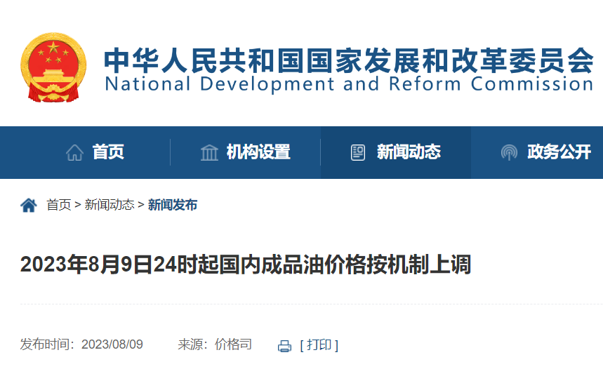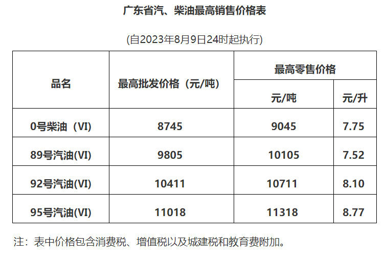 根據(jù)近期國際市場油價變化情況,按照現(xiàn)行成品油價格形成機制,自2023年8月9日24時起,國內汽、柴油價格(標準品,下同)每噸分別提高240元、230元。調整后,各省(區(qū)、市)和中心城市汽、柴油最高零售價格見附表。相關價格聯(lián)動及補貼政策按現(xiàn)行規(guī)定執(zhí)行。