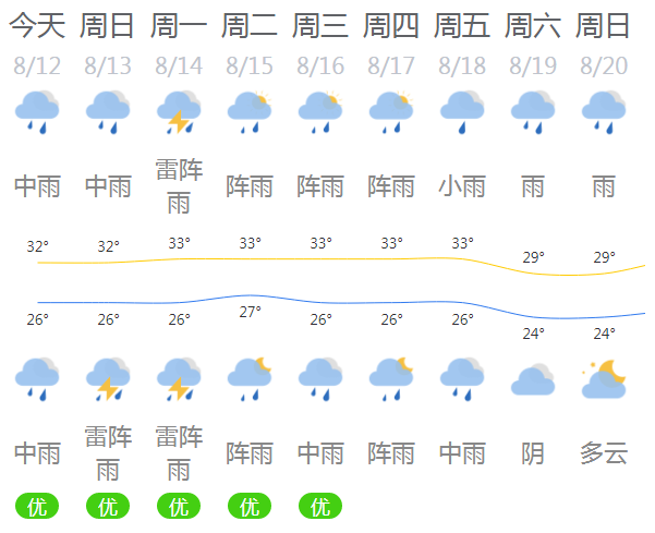 14日,多云,有雷陣雨局部大雨,氣溫26~32℃。