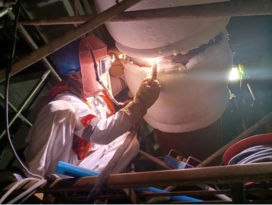 項目工作人員在主廠房汽機零米熱段進行焊接。
