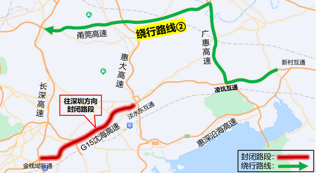 繞行路線②:由凌坑互通,轉(zhuǎn)廣惠高速、甬莞高速往深圳方向(見圖2)。