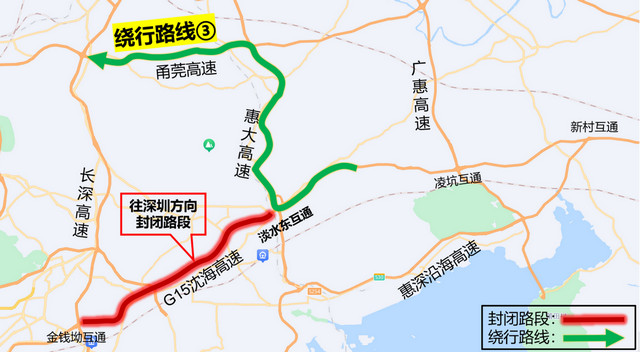 繞行路線③:由淡水東互通,轉(zhuǎn)惠大高速、甬莞高速往深圳方向(見圖3)。