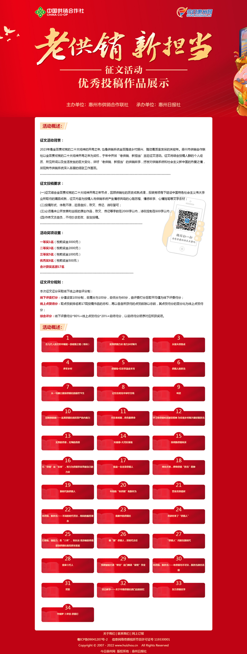 根據(jù)征文要求,要結(jié)合全面貫徹黨的二十大精神開局之年特點(diǎn),反映在黨的領(lǐng)導(dǎo)下,供銷合作事業(yè)所取得的矚目成就,回顧供銷社的歷史點(diǎn)滴,征文內(nèi)容為投稿人與供銷系統(tǒng)產(chǎn)生情感共鳴的心路歷程、情感故事、心情隨筆等文字素材,文體以散文、傳記、詩歌為主。經(jīng)評委精選,部分稿件將進(jìn)行線上展示收集點(diǎn)贊,并綜合評委得分及點(diǎn)贊數(shù)評出作品排名;顒又鬓k方邀請廣大讀者掃碼進(jìn)入點(diǎn)贊頁面,點(diǎn)贊喜愛的作品。