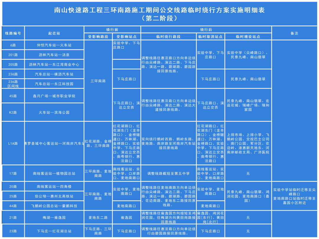 。1)調(diào)整6路、201路、205路、236路、236區(qū)間線往惠淡路口方向單邊繞行由古塘坳立交經(jīng)尖峰路、演達(dá)二路、下馬莊路、演達(dá)一路、碧湖路、碧園路至三環(huán)南路接回原線路,往實(shí)驗(yàn)中學(xué)方向維持不變。