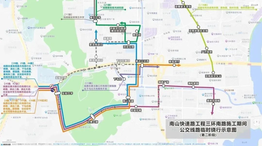 (2)調(diào)整45路、K2路往惠淡路口方向單邊繞行由古塘坳立交經(jīng)尖峰路、演達(dá)二路、演達(dá)大道、演達(dá)一路至南岸路接回原線路,往實(shí)驗(yàn)中學(xué)方向維持不變。