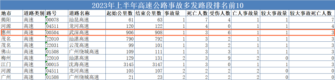 廣東省公安廳交通管理局近日曝光2023年上半年國省道、高速公路十大事故多發(fā)路段,其中涉茂名市4處、湛江市4處、河源市3處,事故多發(fā)路段系由公安交管部門綜合分析路段事故量、死亡人數(shù)、受傷人數(shù)、亡人事故量、較大事故量等因素得出。