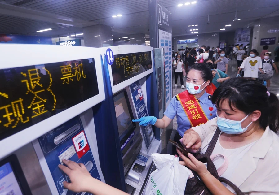 志愿者為過往旅客提供自助購票指導、 路線引導等多項服務(wù)。