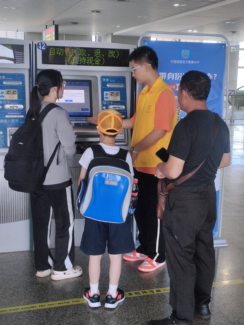 暑運出行旺季,工作人員為旅客有需要的旅客提供問詢、指引等服務(wù)。