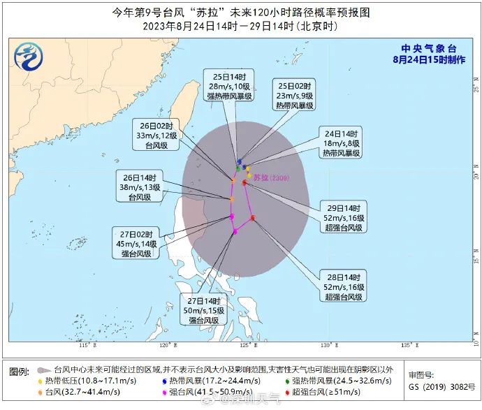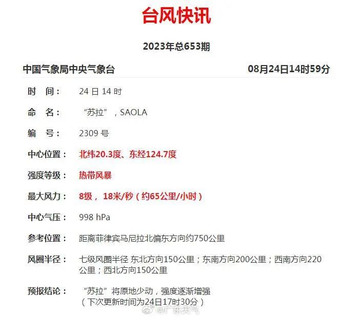 原位于菲律賓以東的西北太平洋洋面上的熱帶低壓已于24日14時加強為今年第9號臺風“蘇拉”(熱帶風暴級,英文名:Saola,來源:越南,意義:一種動物),其中心位于廣州市東南方向約1200公里,也就是北緯20.3度、東經(jīng)124.7度,中心附近最大風力8級(18米/秒),中心最低氣壓998百帕。預計,24-29日“蘇拉”路徑以原地回旋為主,強度逐漸加強。