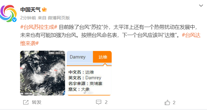 目前除了臺風”蘇拉”外,太平洋上還有一個熱帶擾動在發(fā)展中未來也有可能加強為臺風。按照臺風命名表,下一個臺風應該叫”達維”。