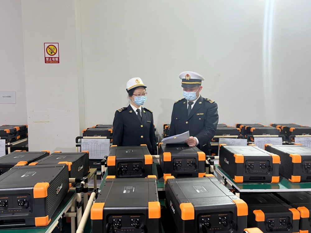海關(guān)部門(mén)多措并舉助力惠州鋰電池產(chǎn)品遠(yuǎn)銷(xiāo)海外。圖為惠州海關(guān)關(guān)員對(duì)出口鋰電池實(shí)施查驗(yàn)作業(yè)。