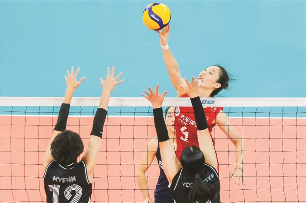 8月21日,中國隊球員王逸凡(上)在比賽中扣球。新華社發(fā)