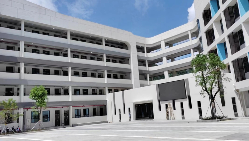 學校占地面積約3.3萬平方米,總建筑面積約3.2萬平方米,辦學規(guī)模36個教學班。校內(nèi)由6棟教學樓、一棟雙層體育館組成,各個教學樓功能分明,分布小學部和初中部、行政樓、實驗樓等。學校建筑以灰白色為主色調(diào),不同功能的教學樓,點綴橙、藍、綠等不同顏色。