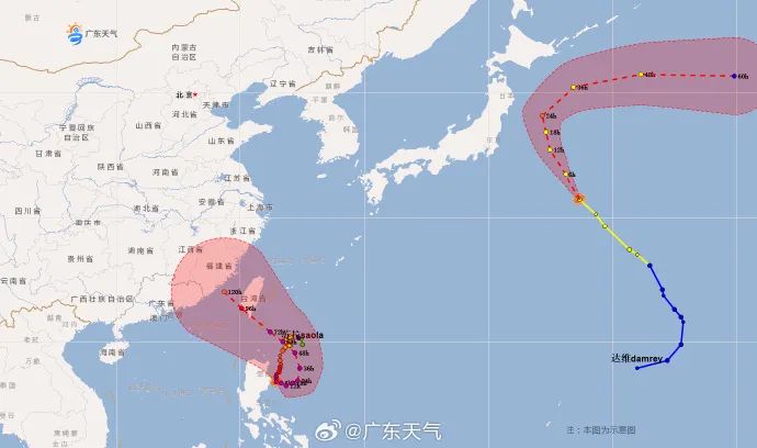 中央氣象臺預(yù)計,“蘇拉”將先在菲律賓呂宋島東北部洋面徘徊,29日開始向西北方向移動,向臺灣島南部到巴士海峽一帶海域靠近,強(qiáng)度維持或有所減弱,將于30日夜間掠過臺灣島南部,并將于31日白天進(jìn)入臺灣海峽。