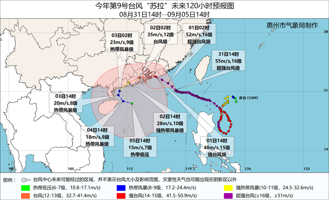 惠州市氣象臺8月31日16時40分發(fā)布:31日16時,今年第9號臺風“蘇拉”(超強臺風級)中心位于惠東港口東南方向約320公里的南海東北部海面上,中心附近最大風力16級(55米/秒)。預計“蘇拉”將于9月1日下午至夜間在惠來到香港一帶沿海登陸(強臺風級或超強臺風級,14級~16級),或近海擦過折向西偏南方向。