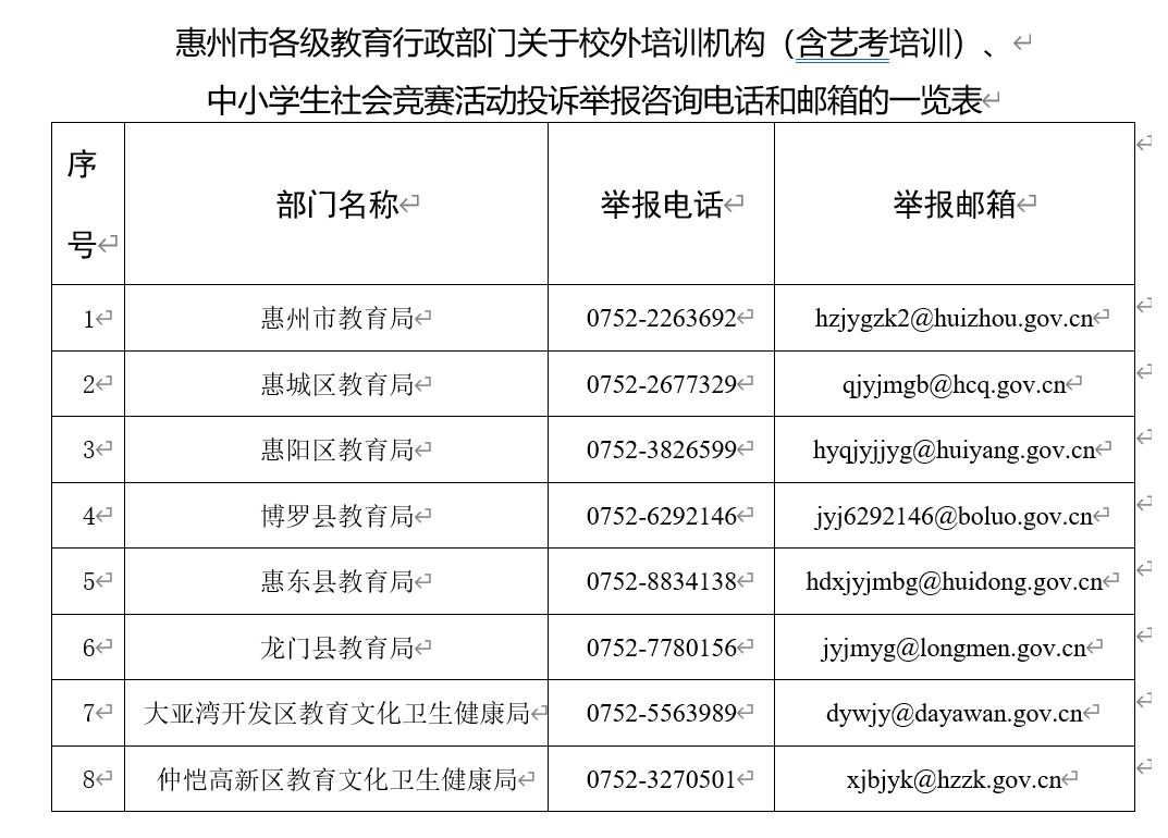 8月29日,惠州市教育局發(fā)布《關于公布惠州市中小學生校外培訓(含藝考培訓)、中小學生社會競賽活動投訴舉報咨詢電話和郵箱的公告》,凡是涉及校外培訓機構(含藝考培訓)資質、課程、師資、招生、收費、侵害未成年人身心健康等方面問題,以及面向中小學生的各類社會競賽活動問題都可以舉報。