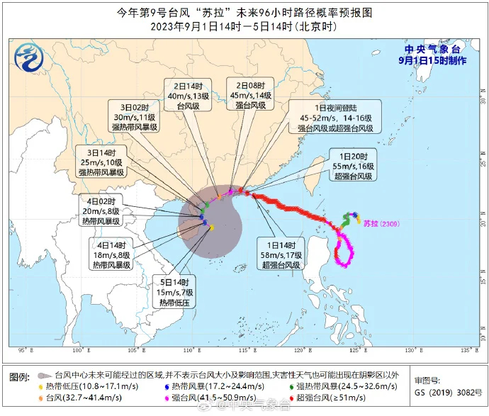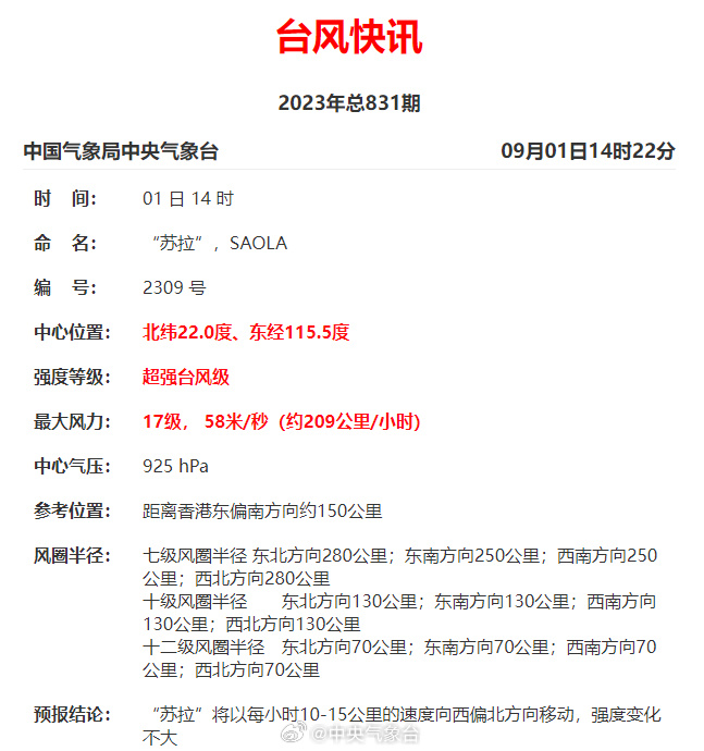 下午14時(shí),超強(qiáng)臺(tái)風(fēng)“蘇拉”中心附近最大風(fēng)力17級(jí)(58米/秒)。預(yù)計(jì),“蘇拉”將以每小時(shí)10~15公里的速度向西偏北轉(zhuǎn)偏西方向移動(dòng),將于今天夜間到明天上午以強(qiáng)臺(tái)風(fēng)級(jí)或超強(qiáng)臺(tái)風(fēng)級(jí)在廣東惠東到臺(tái)山一帶沿海登陸,也不排除在廣東中部近岸海面向西偏南方向移動(dòng)的可能。