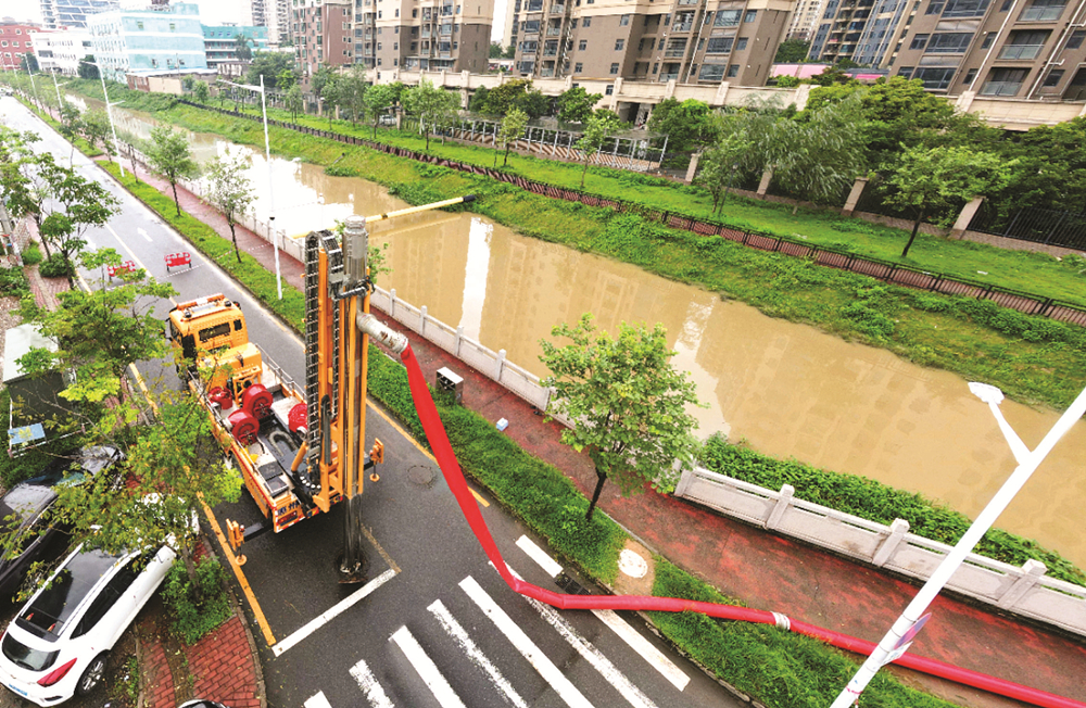 9月2日上午,惠城區(qū)水口街道惠富路附近出現(xiàn)一定程度的內(nèi)澇,惠州市水務(wù)集團(tuán)排水中心出動1臺“龍吸水”大型排澇設(shè)備協(xié)助當(dāng)?shù)嘏潘。該排水中心?yīng)急隊隊長胡洪介紹,中心應(yīng)急排澇救援使用的“龍吸水”共有3臺,其中1臺抽水量可達(dá)每小時1000立方米,2臺抽水量可達(dá)每小時3000立方米。