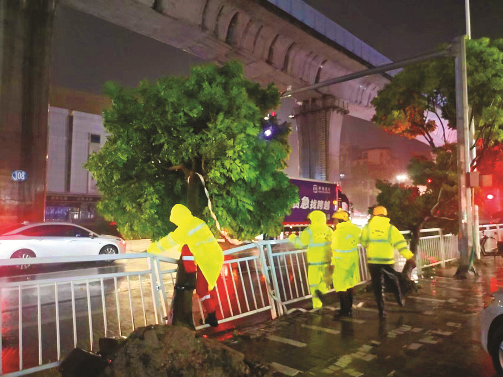 “惠博大道雙壁灣附近出現(xiàn)樹木倒伏,請迅速到場處理……”9月1日晚9時30分許,惠州市城投城市生態(tài)科技有限公司管養(yǎng)部經(jīng)理吳立華和同事接到電話后約10分鐘就抵達(dá)現(xiàn)場。事發(fā)地路邊的幾棵樹木被連根拔起,原本單向四車道的道路僅剩一條車道可通行,大家迅速開始清障!霸缫环昼娗逭贤戤,就早一分鐘解決路面的交通隱患!眳橇⑷A說,該公司管養(yǎng)部共出動40余人次,分9個機動小組負(fù)責(zé)轄區(qū)內(nèi)的路面清障保暢通工作。