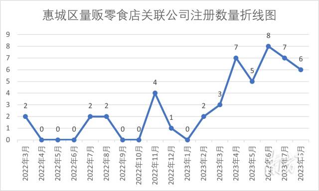 惠城區(qū)量販零食店關(guān)聯(lián)公司注冊(cè)數(shù)量折線圖