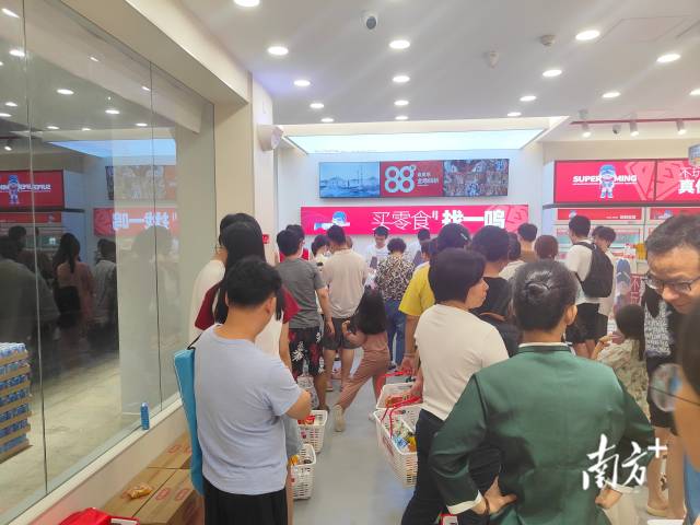 8月27日晚,惠城區(qū)南壇東路新開(kāi)業(yè)的一家“趙一鳴零食”店門(mén)口,一店員正拿著喇叭大聲吆喝著,附近居民正往店里趕去。店里播放著動(dòng)感的歌曲,孩子們拿著購(gòu)物籃追逐打鬧,店員正在不停地上貨、卸貨。時(shí)值當(dāng)天晚上九時(shí)半,結(jié)賬的人仍大排長(zhǎng)龍,一些貨柜上的零食也售罄。