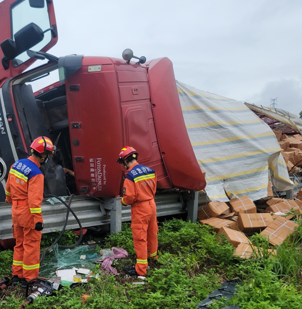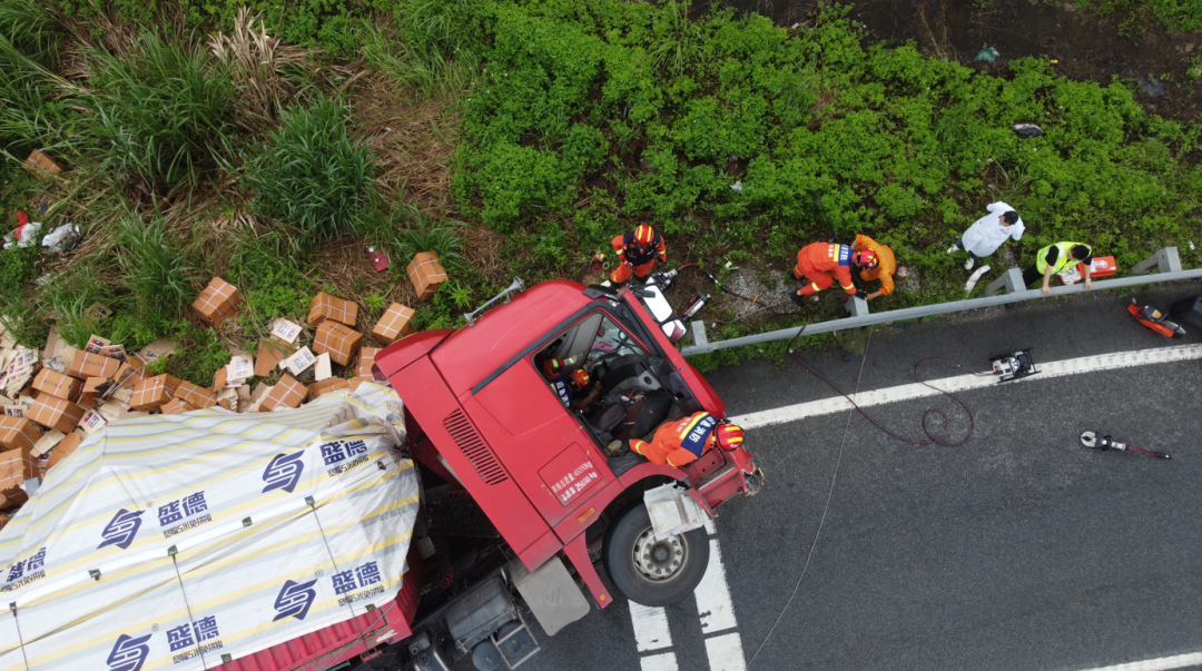 現(xiàn)場消防員發(fā)現(xiàn)一輛貨車在匯入高速主路轉(zhuǎn)彎口處側(cè)翻,貨車車頭變形,造成司機下肢被卡住無法脫身。