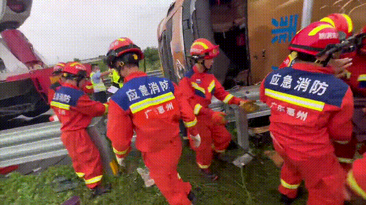 消防員立即用液壓剪切鉗對駕駛室進行破拆將一名被困人救出。并派一名隊員到副駕駛對另一名被困人員進行安撫。同時聯(lián)系吊車起吊車頭,中途再通過液壓破拆工具組給貨車破拆。經(jīng)過近一個半小時的緊急救援,兩名被困人員被救出。