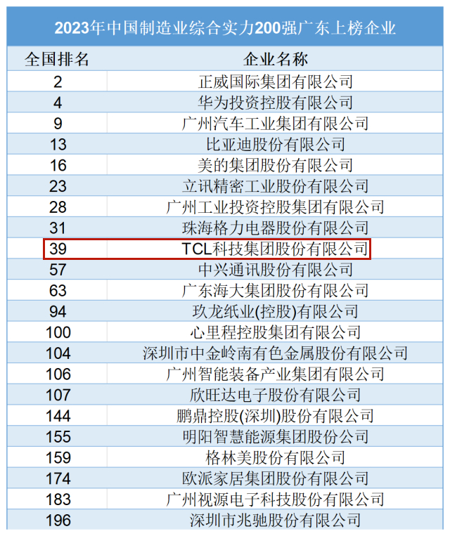 “200強(qiáng)榜單”中,惠州上榜的企業(yè)是TCL科技集團(tuán)股份有限公司,排名第39位。