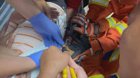 現(xiàn)場消防員使用多功能手持電磨機將鐵片緩慢鋸開,并使用鉗子固定鐵片,防止鐵片對小孩手指造成二次傷害。由于小孩疼痛難忍不停掙扎,消防員難以救援。隨后在家長的同意下,醫(yī)生給小孩手指打入麻藥,并在消防員極力安撫下最終將鐵片成功鋸開。