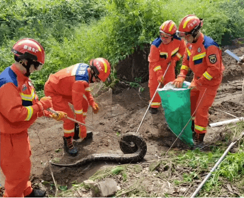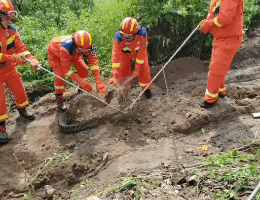 到達現(xiàn)場后,指揮員立即對現(xiàn)場開展偵查,發(fā)現(xiàn)一條蟒蛇正藏在雜草堆下。