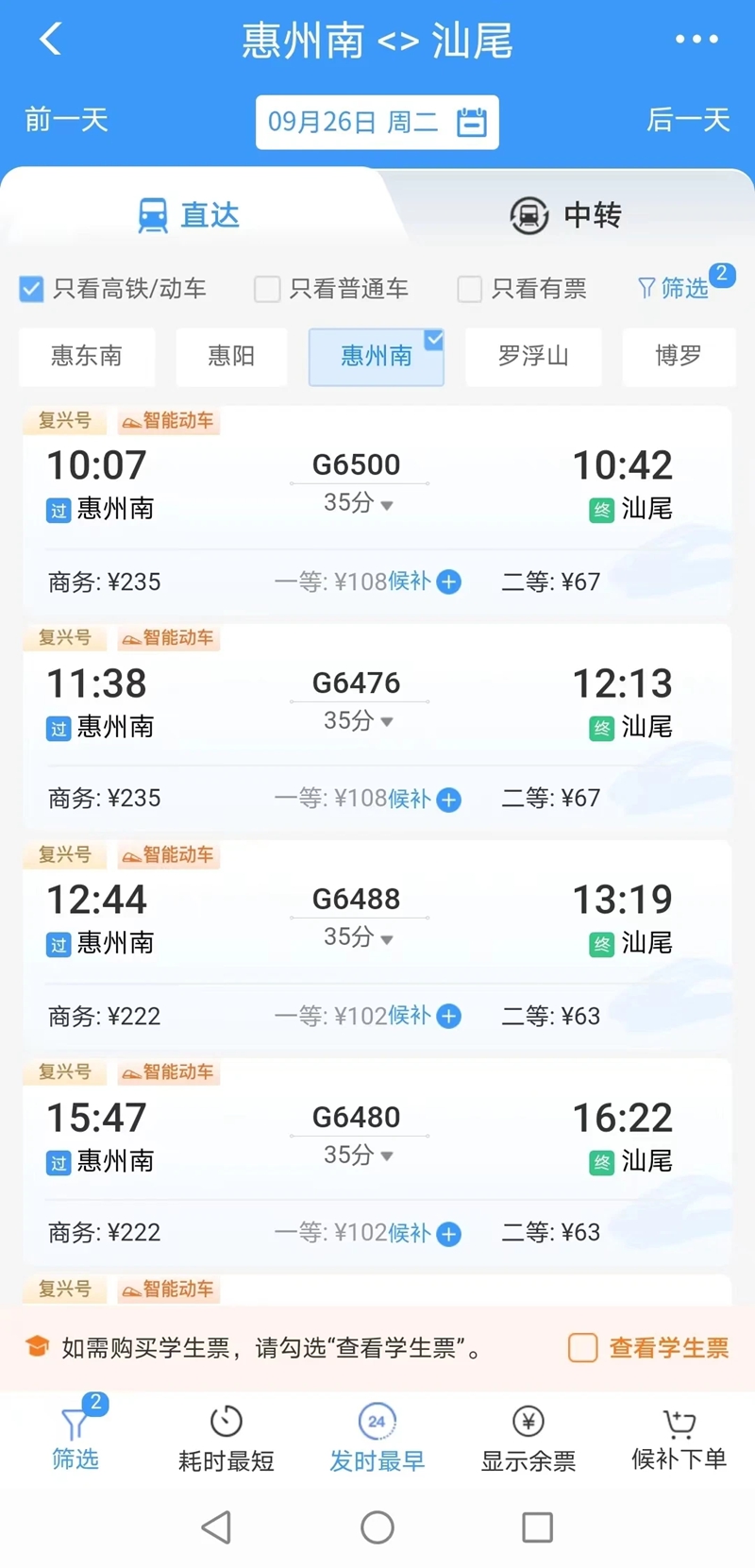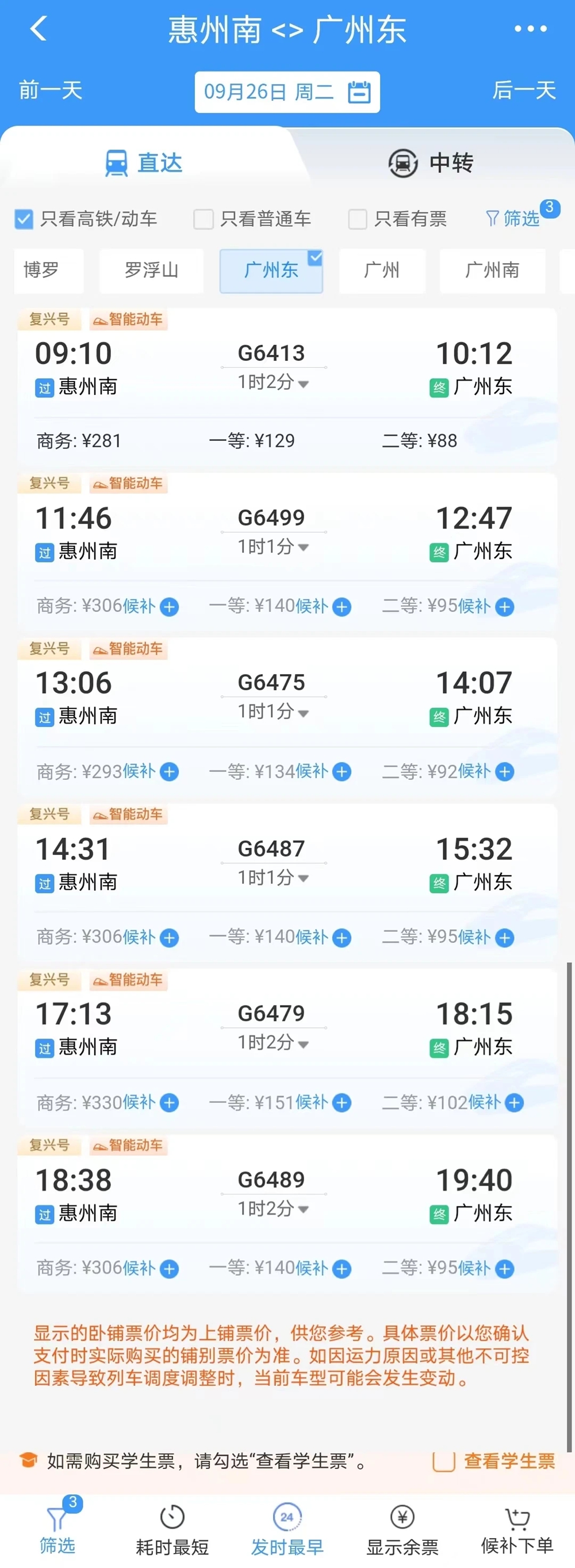 記者在中國鐵路12306網(wǎng)站(12306手機客戶端)查詢看到,9月26日惠州南至廣州東開行6趟動車,首趟車用時1小時2分,商務(wù)座281元,一等座129元,二等座88元;其余5趟車用時1小時1分,二等座從92元到102元不等。