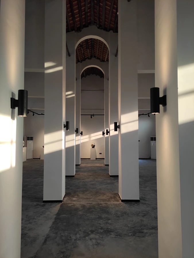 園洲糧倉內(nèi)的8個(gè)聯(lián)排圓筒糧倉,是惠州境內(nèi)保存完好、較為罕見的圓筒糧倉群,造型獨(dú)特,非常具有設(shè)計(jì)感和文藝范。在清華大學(xué)建筑設(shè)計(jì)研究院第三分院副院長(zhǎng)莫修權(quán)指導(dǎo)下,它們被設(shè)計(jì)為青年藝術(shù)倉,打造青年藝術(shù)家孵化、展銷、收藏平臺(tái)。首展當(dāng)日,來自龍門的歐子龍、博羅的何建州、惠城的余樂晴等惠州本地青年美術(shù)家,均在各自的藝術(shù)倉展出精品佳作。