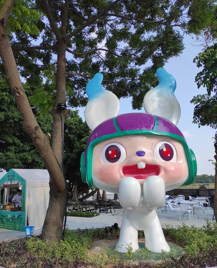 廣場(chǎng)邊,矗立著一個(gè)巨型吉祥物“驚喜兔”,豎起兩只大耳朵,帶著頭盔,機(jī)靈動(dòng)感,動(dòng)作神態(tài)傳遞出活潑開朗、喜悅歡樂。該吉祥物的兩只水狀大耳朵,以形象的、透明的造型,寓意東江水文化生生不息,源遠(yuǎn)流長(zhǎng),成為整個(gè)造型的亮點(diǎn)。與此同時(shí),在開園當(dāng)天,“驚喜兔”IP形象設(shè)計(jì)展同步在青年藝術(shù)倉展出,成為游客打卡點(diǎn)之一。