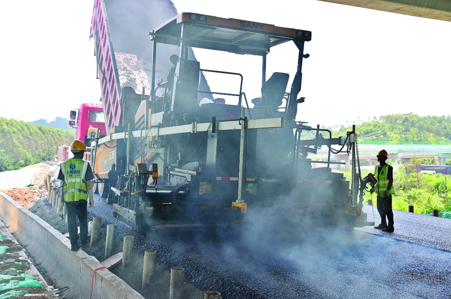 惠龍高速平陵互通路段,工人忙著鋪設(shè)瀝青;葜萑?qǐng)?bào)記者李松權(quán) 攝