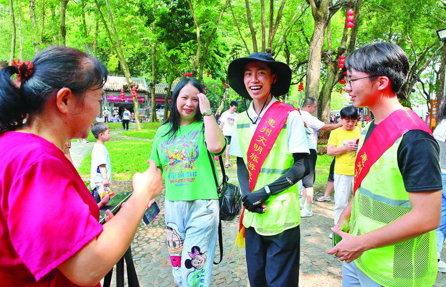 惠州文明旅游志愿者在西湖景區(qū)服務(wù)游客;葜萑?qǐng)?bào)記者鐘暢新 攝