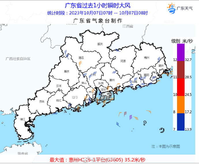 據@廣東天氣 10月7日9時消息,從過去1小時的瞬時大風圖可見,風力主要集中在粵東至珠三角沿海一帶,其中惠州錄得最大陣風12級(35.2米/秒),這個風力等級是可以吹斷樹枝、吹彎路牌的節(jié)奏。