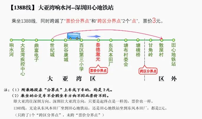 138B線的“跨區(qū)分界線”在大亞灣【塘橫橋】站與深圳【甘角嶺】站之間;“票價分界點”設在【泰德激光】站。