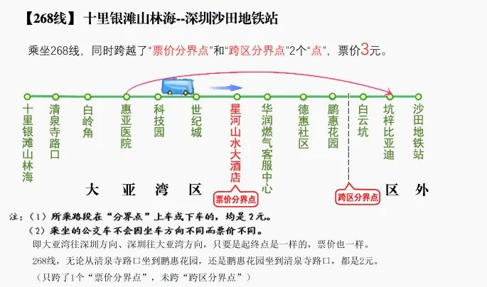 268線的“跨區(qū)分界線”在大亞灣【鵬惠花園】站與惠陽【白云坑】站之間;“票價分界點”設在【星河山水大酒店】站。