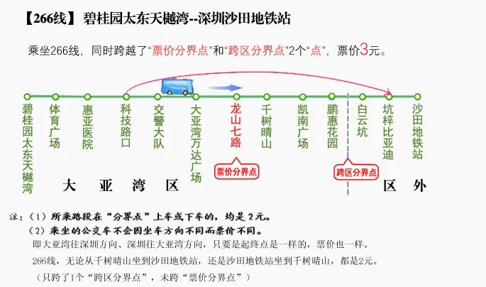 266線的“跨區(qū)分界線”在大亞灣【鵬惠花園】站與惠陽【白云坑】站之間;“票價分界點”設在【龍山七路】站。