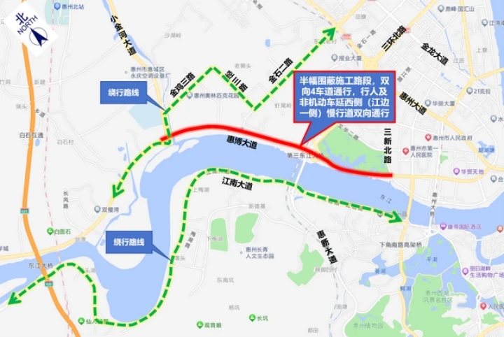 施工期間,惠博大道(惠博大道/小金河大道路口至惠博大道/三新北路路口)半幅封閉施工,施工期間保留雙向4車道通行;施工路段行人及非機(jī)動(dòng)車沿西側(cè)(江邊一側(cè))慢行道雙向通行。