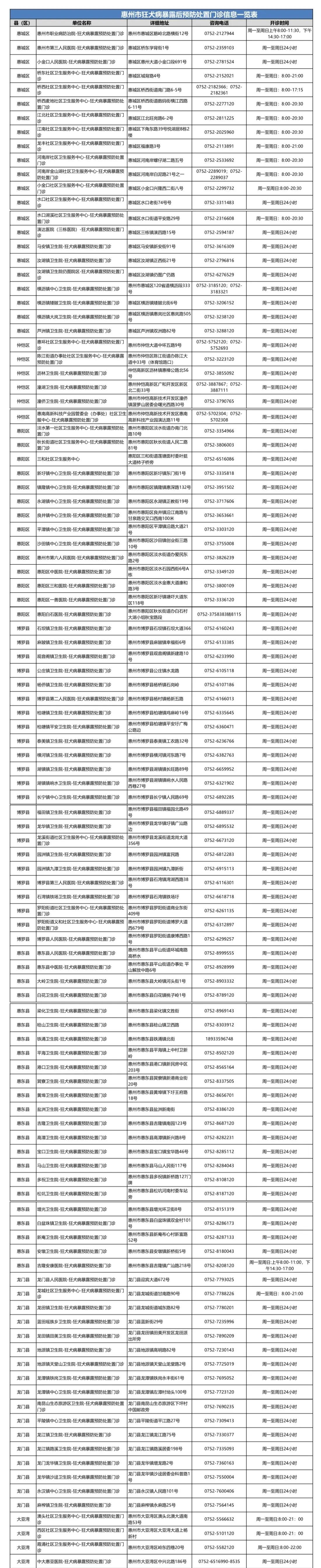 惠州市狂犬病暴露后預(yù)防處置門診信息一覽表