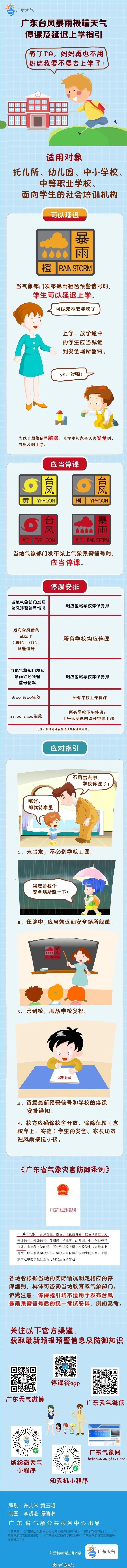 根據(jù)《廣東省氣象災(zāi)害防御條例》,當(dāng)氣象部門發(fā)布暴雨紅色預(yù)警信號(hào),可視為停課信號(hào),其生效期間,托兒所、幼兒園、中小學(xué)校、中等職業(yè)學(xué)校應(yīng)當(dāng)停課。當(dāng)暴雨橙色預(yù)警生效,學(xué)生可以延遲上學(xué),上學(xué)、放學(xué)途中的學(xué)生應(yīng)當(dāng)就近到安全場(chǎng)所暫避。
