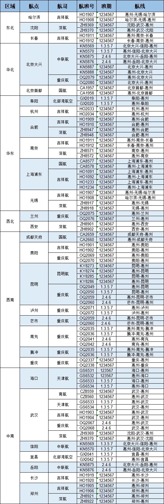 據(jù)悉,換季后,惠州機(jī)場(chǎng)將通航哈爾濱、沈陽(yáng)、長(zhǎng)春、北京首都、北京大興、阜陽(yáng)、杭州、合肥、南京、上海浦東、無(wú)錫、蘭州、西安、成都天府、貴陽(yáng)、昆明、瀘州、芒市、南充、騰沖、重慶、?凇⑽錆h、信陽(yáng)、宜昌、岳陽(yáng)、長(zhǎng)沙、鄭州等航點(diǎn)。同時(shí),加密北京大興、昆明、南充、武漢等航點(diǎn),并陸續(xù)新增阜陽(yáng)、海口、芒市和騰沖等新航點(diǎn)。