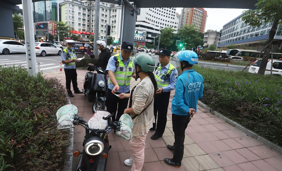 當(dāng)日下午5時(shí)許,記者在市區(qū)鵝嶺南路與鵝嶺西路交會(huì)路口發(fā)現(xiàn),一些“摩電”駕乘人員還是存在不戴安全頭盔、隨意變道、逆行等交通違法行為。不久,一輛電動(dòng)自行車沿鵝嶺西路由西往東行駛,駕乘人員因未佩戴安全頭盔被執(zhí)勤交警攔下進(jìn)行教育、處罰。“頭盔忘在家里了,下次一定注意!瘪{駛員王先生認(rèn)為,駕駛摩托車、電動(dòng)自行車不戴安全頭盔,確實(shí)有一定的危險(xiǎn)性。
